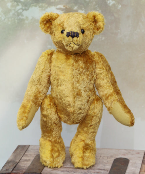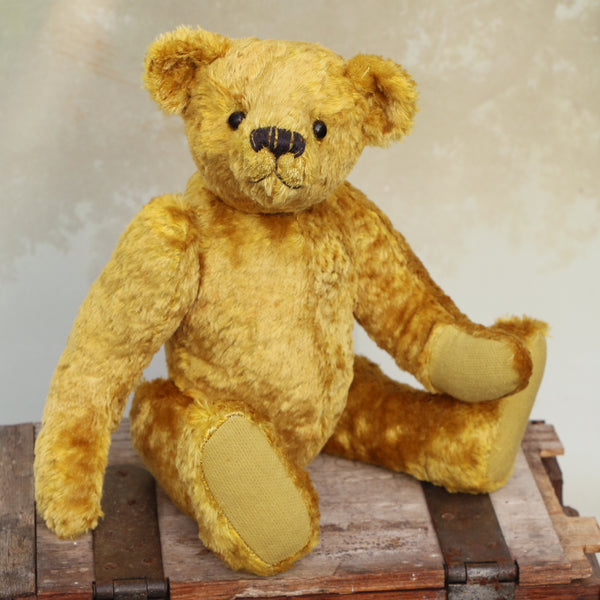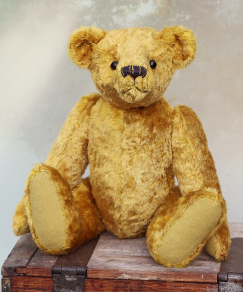 The instructions are thorough but we are on hand for extra support by phone. Kingsley is made from beautiful vintage gold crushed velvet, the paw pads are made from the reverse side of the velvet and he has boot button eyes.