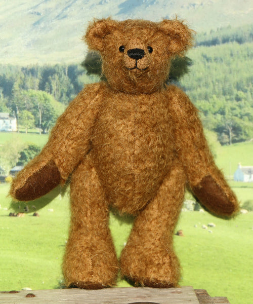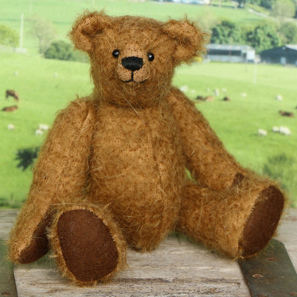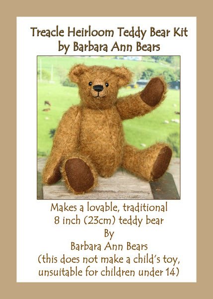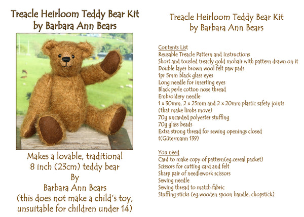 We have created this kit with everything you need apart from scissors and a few things you will have at home. The instructions are thorough but we are on hand for extra support by phone. The Treacle kit has lovely soft brown German mohair, we have drawn the pattern out on the mohair so you don't have to worry about not having enough or fitting it on. He has polyester stuffing and some plastic pellets to add weight and a little squidgyness.  This kit is nicely boxed so you can give it as a gift, and we can put in one of our own gift tags and a Birthday card or Christmas card from our own drawings for free if you ask us to.